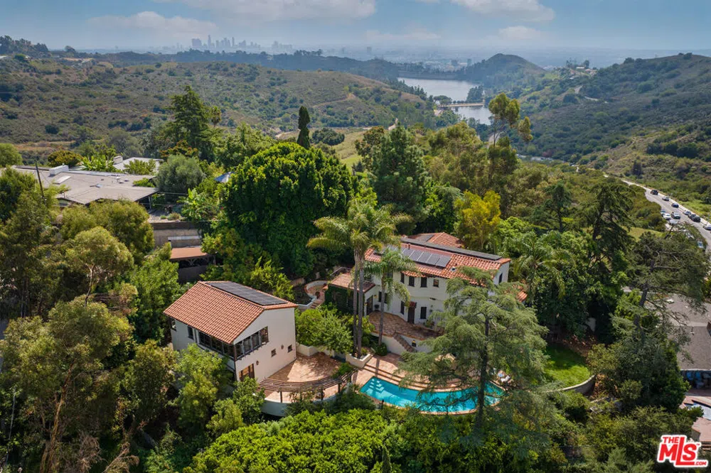 Secluded Hollywood Hills gated 2-home compound (main house circa 1930's + 2-story guest house circa 2016 total approximately 6,289 sq ft) with panoramic views full of Mediterranean charm! Ideal for a live/work environment or extra source of income. Main house (4,028 sq ft; 4 beds, 4 baths-per appraiser includes separate en suite) features classic entrance foyer, baronial-sized living room w/fireplace & terrace; entertainer's dining room can seat 12 or more; library/office/extra bed & bath; center-island eat-in chef's kitchen opening to outdoor terrace w/views; most systems upgraded to the highest standards w/main house on owned solar. Guest house (2,261 sq ft - estimated; 1 or 2 beds, 2 baths) main level contains main room, bath & laundry; 2nd floor living quarters, kitchenette & bath; lower level wine cellar & gym. Grounds blend terraces, courtyards, fountains, pool w/spa & verdant water wise gardens w/irrigation. Two separate automobile entrances ensure privacy via 3-car garage+adjacent carport. This warm, gracious, and elegant estate is ideal for tranquil living or large-scale entertaining and is awaiting its next lucky stewards.